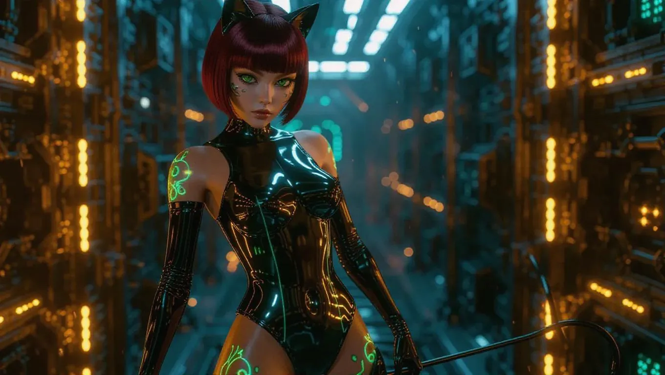 A futuristic catgirl action figure, with a modular tail whip and a silky chrome bodysuit, features luminous emerald tattoos on her thighs. Her short burgundy hair and piercing silver eyes enhance her captivating presence. The packaging glows with bright yellow neon patterns and has magnetic lock panels. Set against a futuristic urban toy factory backdrop, with sparks, performance drones, and energy veins embedded in the walls. Lighting is dynamic and colorful, generating mesmerizing shadows and highlights. Style: Sci-Fi, Cyberpunk.