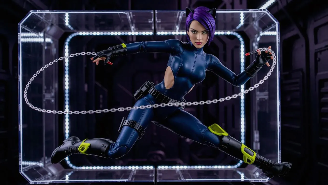 A sleek, futuristic female android action figure in a form-hugging, navy-blue catsuit with cut-out sections exposing her cybernetic enhancements. Biker boots with bright-yellow accents, utility belt with miniature gadgets. Short, dark-purple hair in a spiky style, cat-like, glowing green eyes. Dynamic, leaping pose, holding a charged whip. Transparent, cube-shaped packaging with cycling LED lights, highlighting the sheen and sleek lines, exuding an enigmatic, striking vibe.