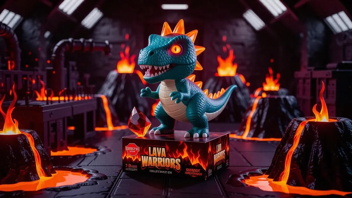 A chibi dinosaur toy in lava armor with translucent fire spikes and glowing red eyes, posed in a proud stance. The toy box features erupting volcano graphics and "Lava Warriors" branding, including a collectible lava shard. Set in a factory with a charred production line, bubbling lava pools, and glowing seams, the scene is illuminated by harsh, dramatic light casting long shadows. Style: vivid and energetic, with a touch of heroism.