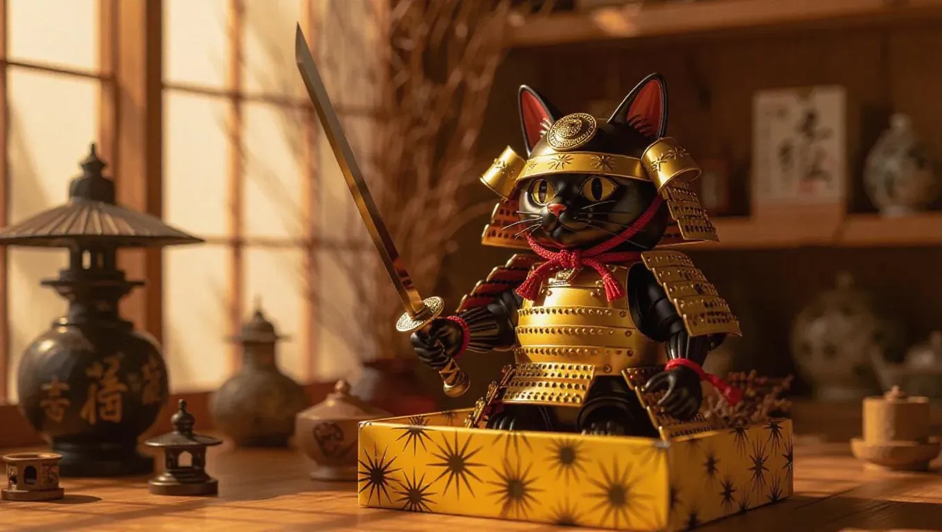 A samurai cat warrior toy clad in lacquered yellow armor adorned with starburst patterns and quad blade tails. The box features waves, Japanese patterned stamps, and a jute pouch. Set against an artisan workspace with handcrafted toy shelves, the scene is illuminated by golden sunset light, casting elongated shadows that enhance the toy's detailed craftsmanship. Style: Realistic.