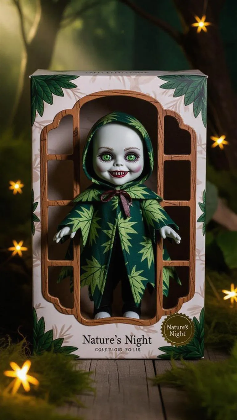 A mystical forest vampire doll, a nature-infused collector toy, features a leaf-patterned cloak, fanged grin, and forest green eyes. The doll is displayed in a box with wooden-trimmed windows, earthy patterns, and a “Nature's Night” foil seal. Set against a background of a lush yet eerie woodland, complete with glowing fireflies and soft moss. Gentle, dappled light casts organic shadows, enhancing the doll’s connection to nature. Style: Nature fantasy.