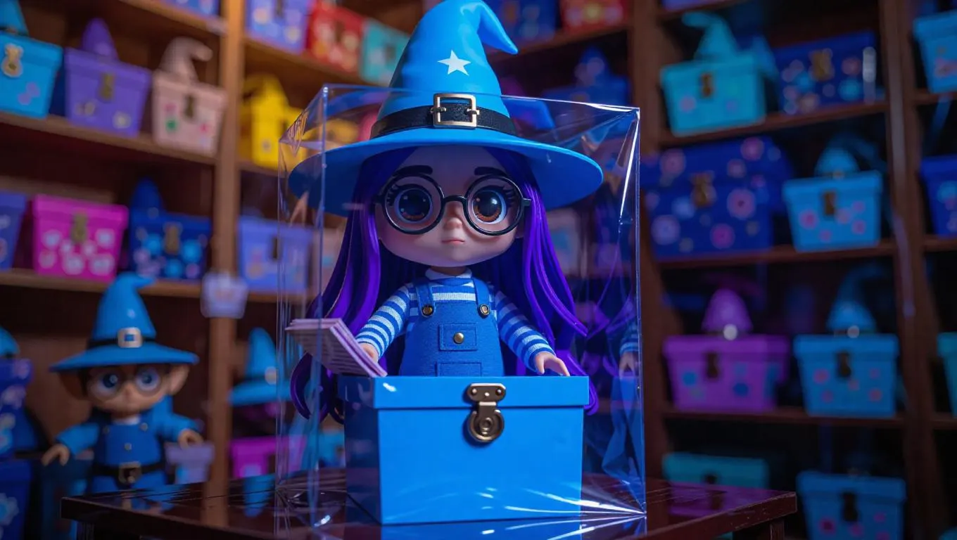 C4D, a bright blue paper toy box is completely wrapped in transparent plastic film. The box body has a large observation window to show the inside. A 3D cartoon-style wizard doll is wearing indigo overalls with a silver and white striped shirt, long purple hair untied, a wise face with big golden eyes and lush eyebrows, a pointed hat and classic glasses, holding a spellbook cup, and wearing magical boots. The package contains two changeable hats and three pairs of wizard shoes of different styles. The background features a mystical toy store display stand in deep tones. The plastic packaging film reflects the ambient light, presenting a mysterious texture. The overall picture is full of the magic of a collectible figurine.