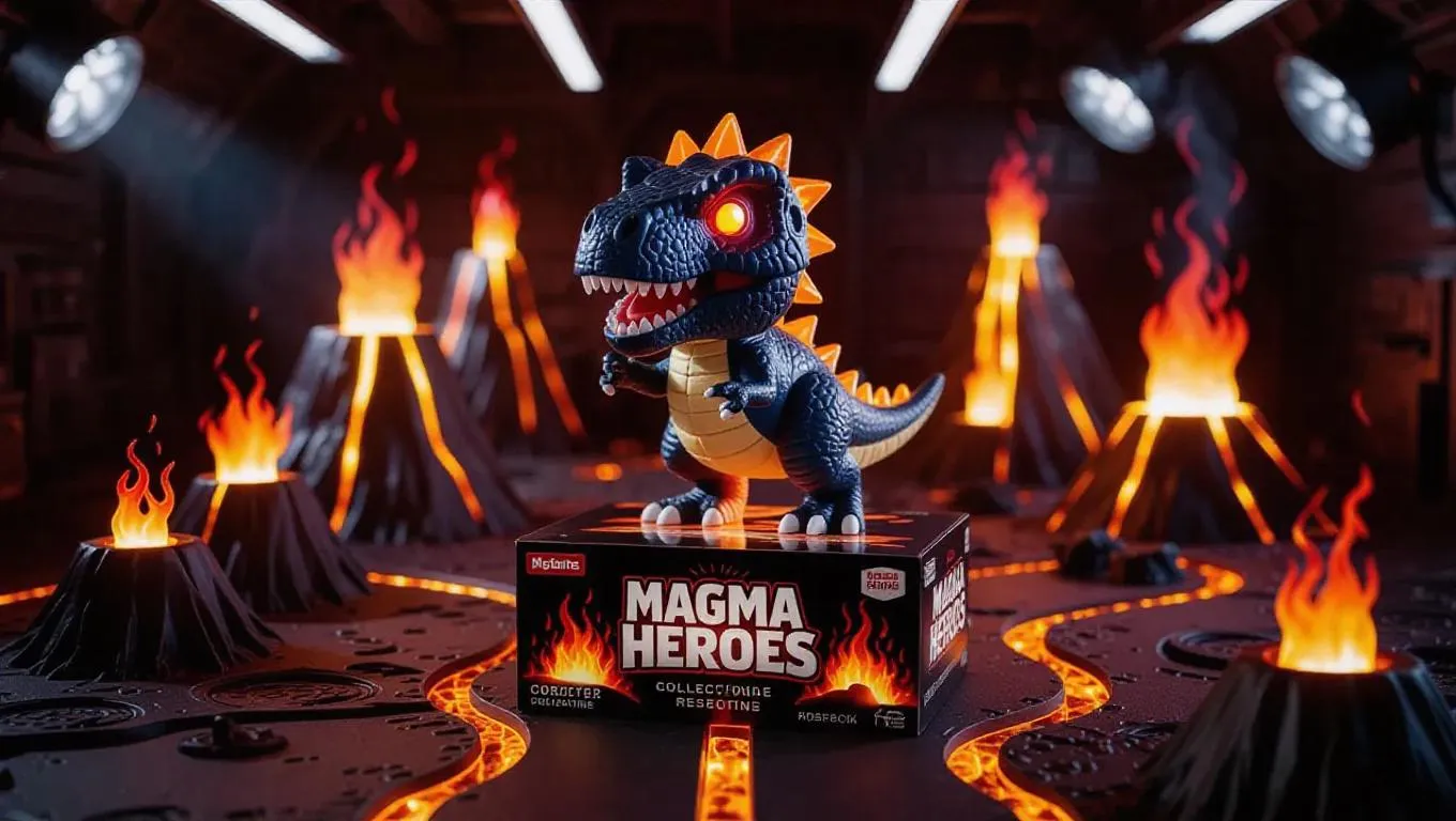A chibi dinosaur toy in lava armor with translucent fire spikes and glowing red eyes, posed in a cool superhero landing. The toy box features erupting volcano graphics and "Magma Heroes" branding, including a collectible fire core. Set in a manufacturing zone with an explosion-research area, molten paths, and shining seams, the scene is illuminated by exciting, spotlit light casting cinematic shadows. Style: dynamic and heroic, with a hint of sci-fi.