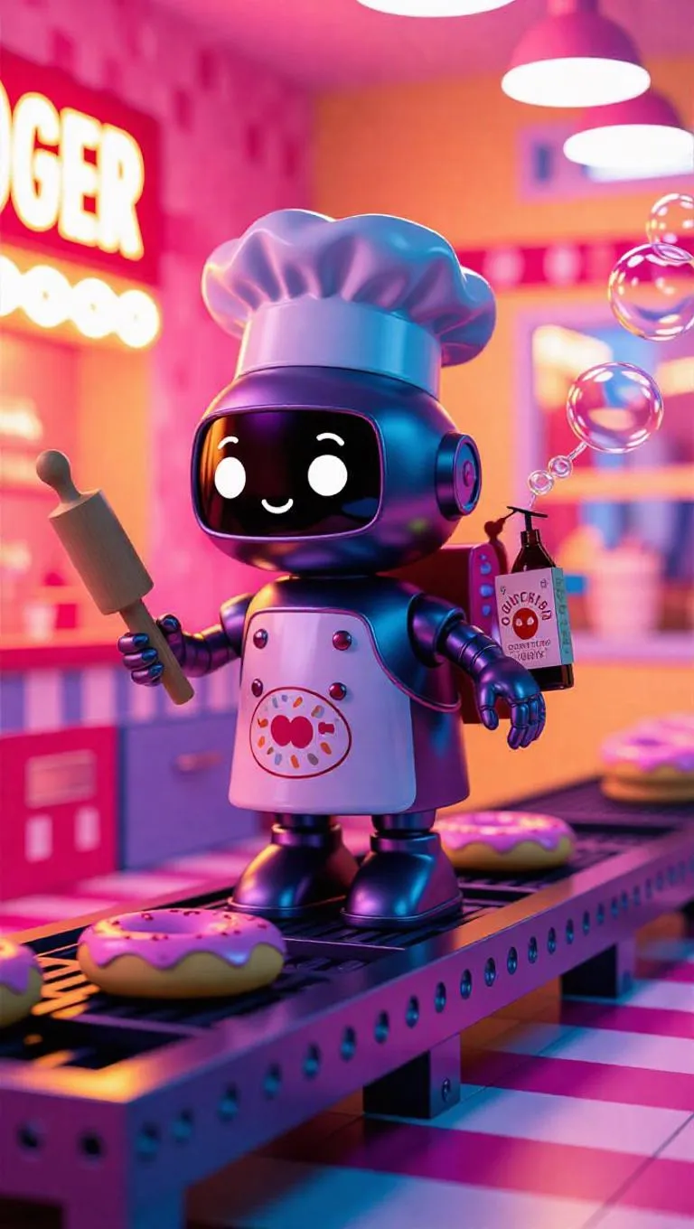 A toy robot chef with rolling pin arms, a cookie-launching backpack, and a balsamic sprayer. The robot has a glossy, metallic body with amusing, exaggerated features. It stands on a toy conveyor belt system with bubbling effects, surrounded by cute diner decor and a whimsical donut pattern on the packaging. Soft, cheerful lighting highlights the robot’s vibrant colors and the action of the conveyor belt, creating a cozy and uplifting atmosphere. Style: Retro-futuristic.