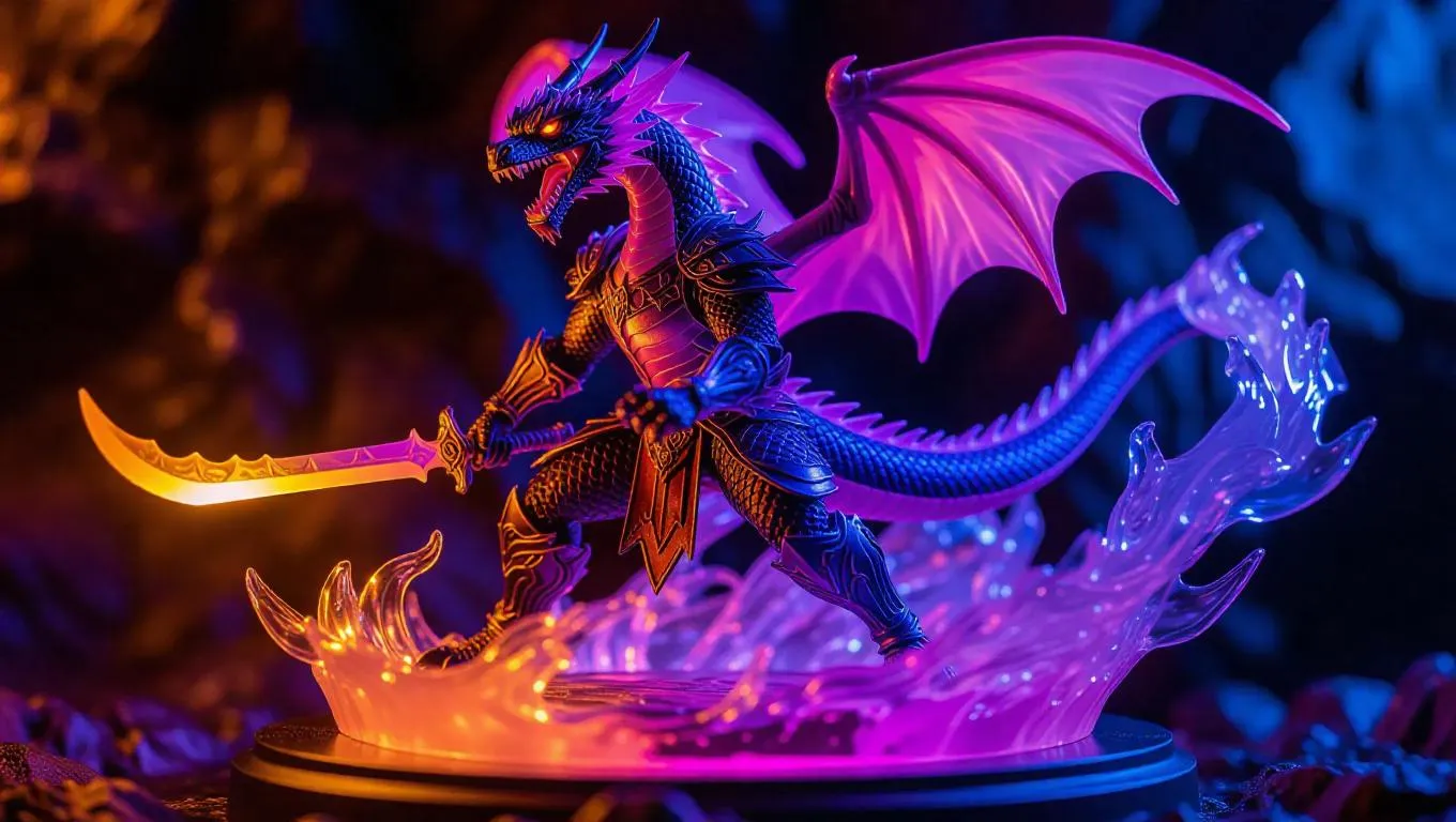 Hyper-detailed toy action figure of a fierce dragon warrior, fusing a fang sword with fiery energy. Translucent energy waves swirl around the figure, crafted from iridescent resin that shifts colors under varying light. The base showcases a floating, volcanic island, capturing the warrior in a dynamic mid-roar pose.