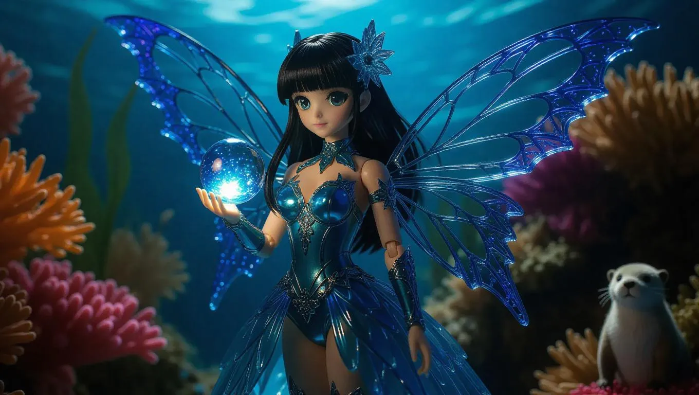 A magical girl action figure with translucent, water-like wings, holding a magical crystal that glows with vibrant aqua energy. Her eyes sparkle like the ocean at sunset, and her outfit is adorned with intricate marine life designs. The toy box features a soothing ocean wave design, set against an underwater scene with vibrant coral and playful sea otters. Style: Realistic with an aquatic fantasy twist.