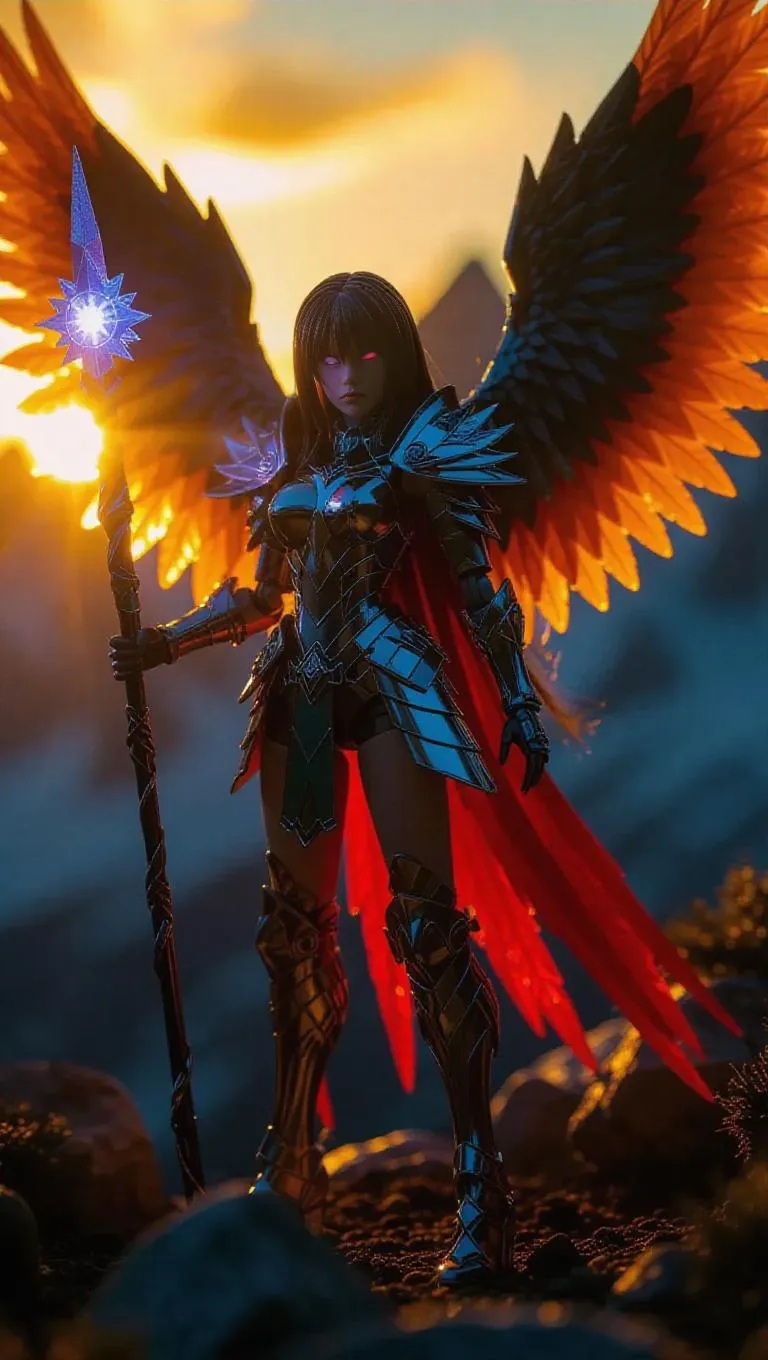 A magical girl action figure with magnificent eagle wings that shine brightly in the light, wielding a powerful staff that transforms into lightning when activated. Her eyes are filled with fierce mountain-shaped sparkles, and her outfit is a bold tribute to wilderness colors. The toy box is embellished with tribal designs, set against a backdrop of rugged mountains under a blazing sun. Style: Realistic with an adventurous fantasy vibe.