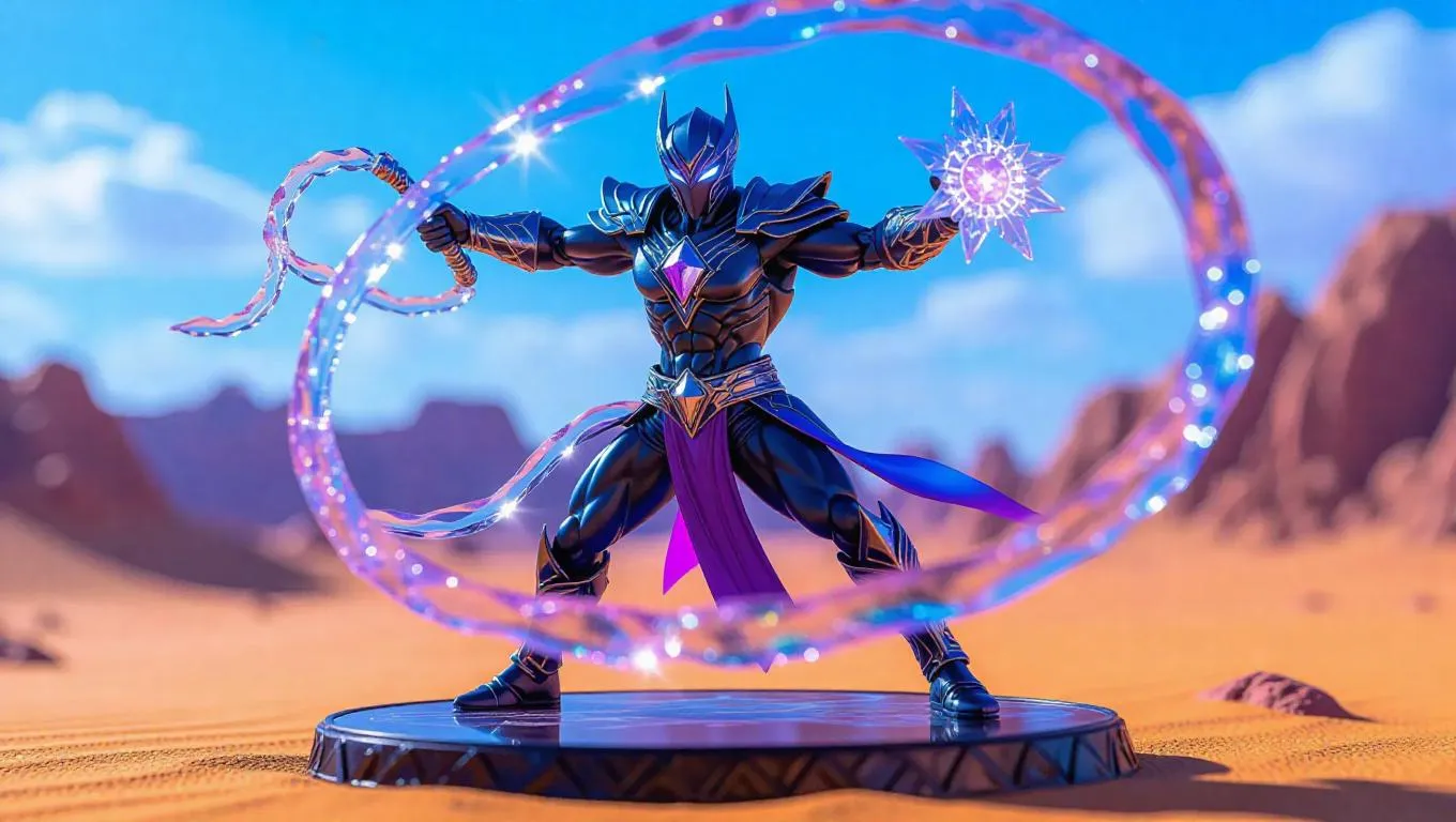 Hyper-detailed toy action figure of a mythical beast tamer, fusing a whip with elemental crystals. Translucent energy waves swirl around the figure, crafted from iridescent resin that shifts colors under varying light. The base showcases a floating, magical desert, capturing the tamer in a dynamic mid-commanding pose.