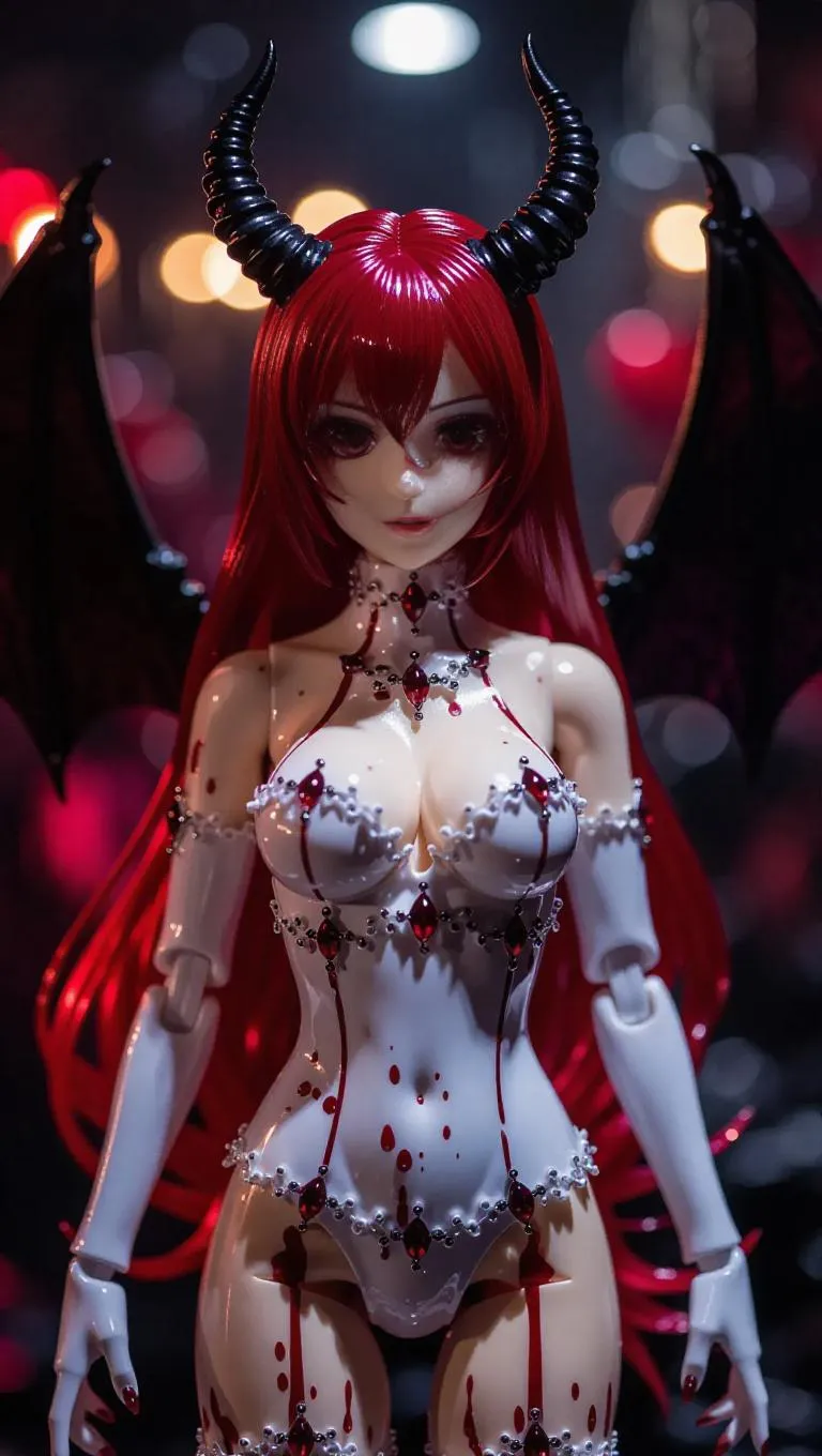 A seductive demon girl action figure with obsidian horns, bat-like wings, and a scanty white latex outfit adorned with ruby jewels. Her long, flowing red hair shimmers, and her starry eyes have a mesmerizing glow. The toy packaging features forbidden seals, deep velvet textures, and a transparent blood-smeared window. In the factory, heated molds and spectral mist surround the assembly lines, creating a forbidden, enchanting atmosphere. Lighting is atmospheric with gentle, striking highlights and heavy shadows. Style: Dark Fantasy, Gothic.