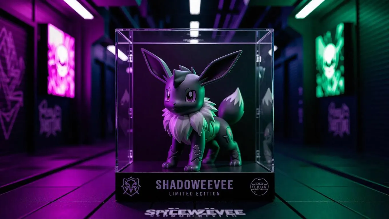An anime-style collectible action figure of Eevee, redesigned as a stealthy tech operative with sleek gray armor plates, glowing purple ears, and robotic shadow tails. The figure is displayed inside a transparent premium toy box with matte black linings, stealth emblem stickers, and "ShadowEevee Limited Edition" branding. The background features a neon-drenched urban alley with graffiti and digital billboards, illuminated by stark blacks and neon greens, creating a mysterious and edgy atmosphere. The lighting is a mix of back and top lights, enhancing the figure's stealthy details. Style: Cyberpunk.