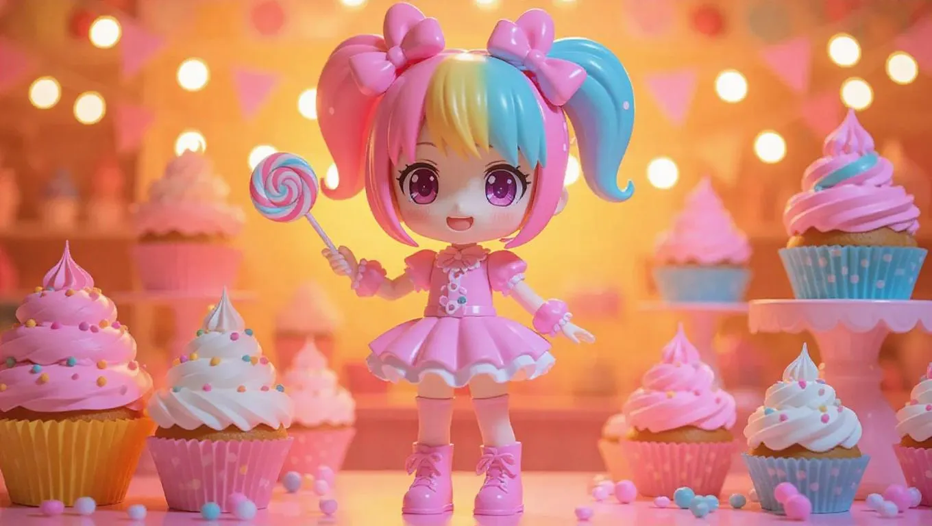 A candy-colored anime girl action figure, dressed as a dessert alchemist, sports frosting-themed hair, a cupcake wand, and meringue boots. The toy box showcases spirals and shiny vivid candy patterns, along with bonus mini-figures. The background depicts a magical bakery creating sweets-themed toys, bathed in cheerful, golden light with a touch of elegant highlights. Style: Chibi anime with a sweet, happy aesthetic.