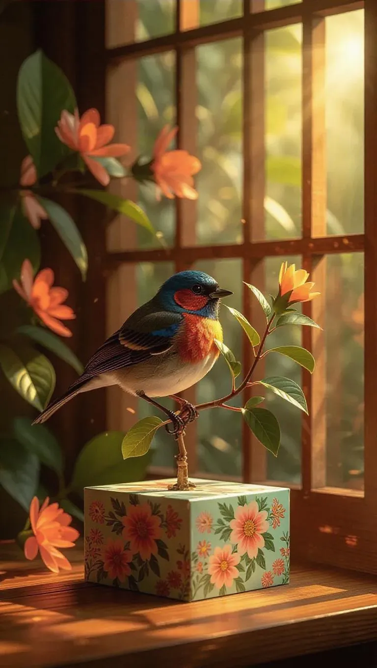 A colorful bird perched on a branch-shaped spinning base inside its box. The packaging has a floral design and a pull-out nature card. Soft, pastel light glows through broad windows in a leafy toy factory, casting a serene and tranquil ambiance. Gentle style blends realism with avian fantasy.