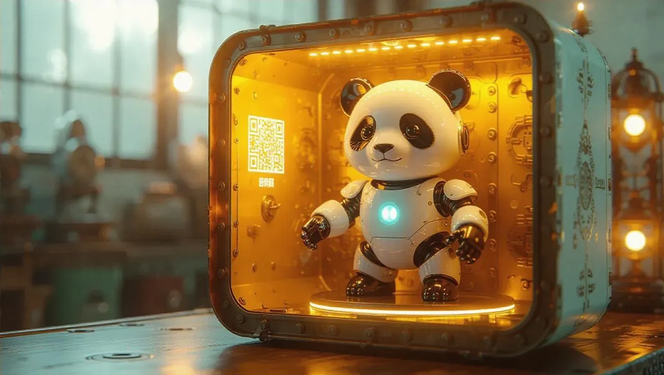A toy robot panda with polished copper and bright mint panels stands on a rotating platform inside its packaging. The box pulses with kinetic energy effects, featuring elegant logos and a QR code that unlocks historical themes. Set in a classic toy assembly facility, the scene is illuminated by vintage, yellow lights casting soft shadows, emphasizing the cultured and historical setting. The style is refined and classic, blending realism with vintage aesthetics.