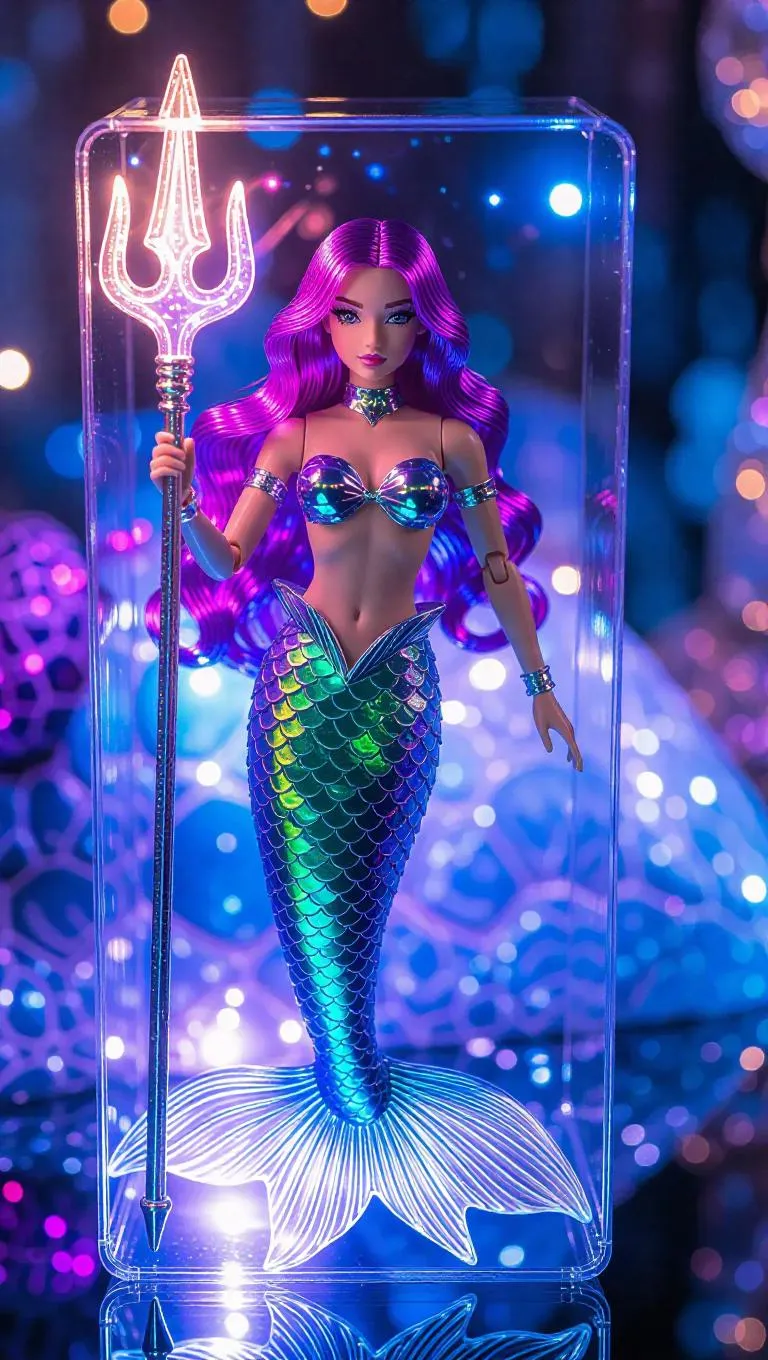 A galaxy-themed mermaid action figure with iridescent fins and star freckles, holding a luminous trident. The packaging features constellation overlays, rainbow holo foil, and oceanic accessories. The background showcases a toy factory shaped like a giant sea turtle, illuminated by the soft, twinkling starlight. Natural, soft front light enhances the mermaid's shimmering scales and the holographic packaging, creating a magical and serene atmosphere. Style: Enchanted realism.