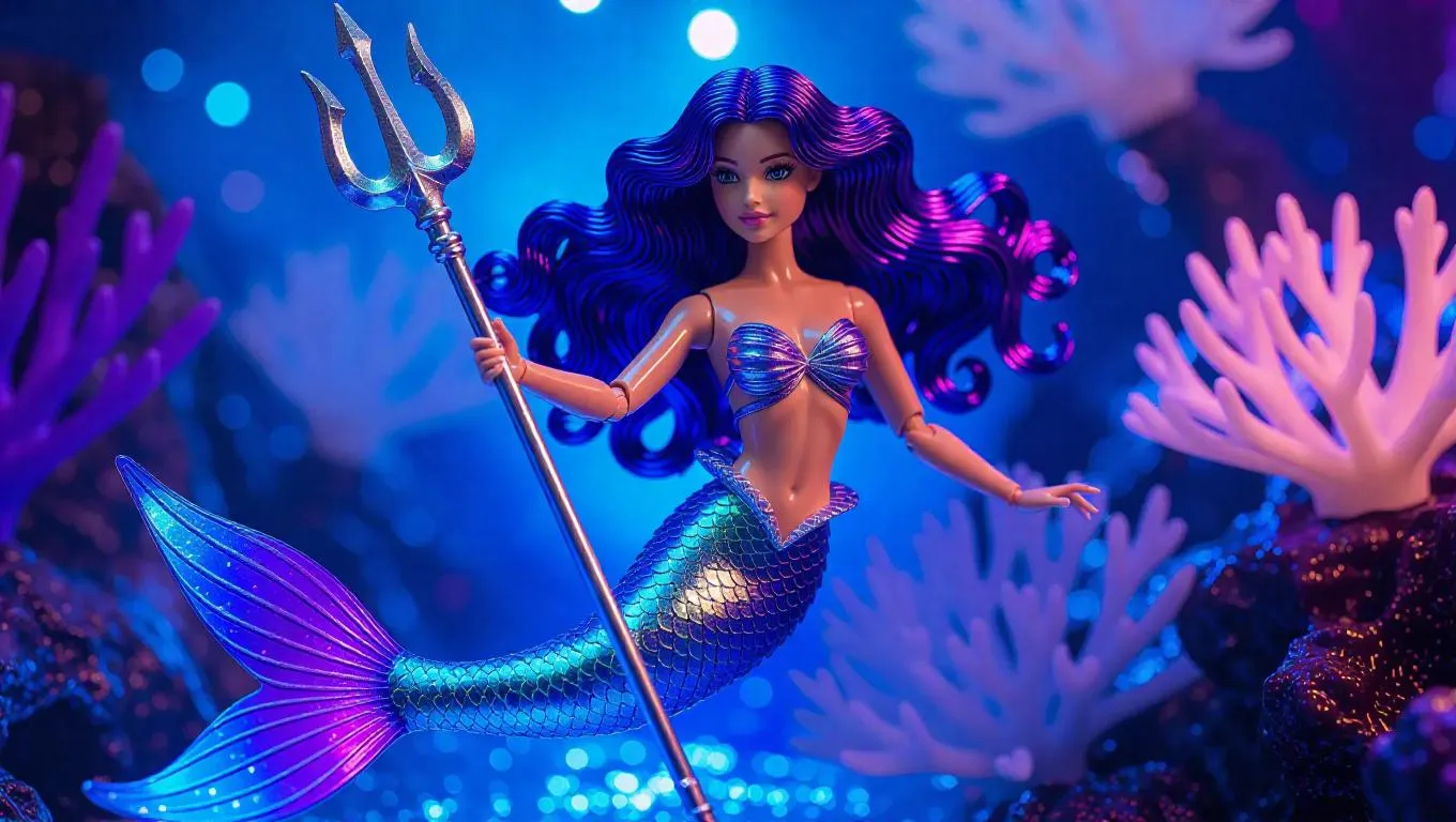 A galaxy-themed mermaid action figure with shimmering fins and scattered star freckles, clutching a starlit trident. The packaging features mystical constellation prints, vibrant holo foil, and nautical accessories. The background showcases a toy factory designed like a giant anemone, illuminated by the soft, twinkling starlight. Natural, soft front light enhances the mermaid's reflective scales and the gleaming packaging, creating a magical and serene atmosphere. Style: Enchanted realism.