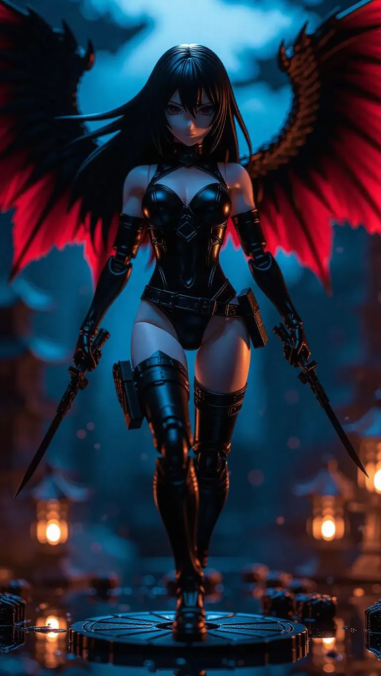 An anime ninja action figure with shadowy wings and stealth wraps flows off her agile body. Jet black hair cascades down her back, and her stealthy skin glows under dim, cool front lighting. The toy box features stealth motifs, red accents, and a crystal-clear window shaped like shuriken. In a night-time scene, covert toy parts float midair under muted, dark side lighting. Style: Modern Fantasy, Stealthy.