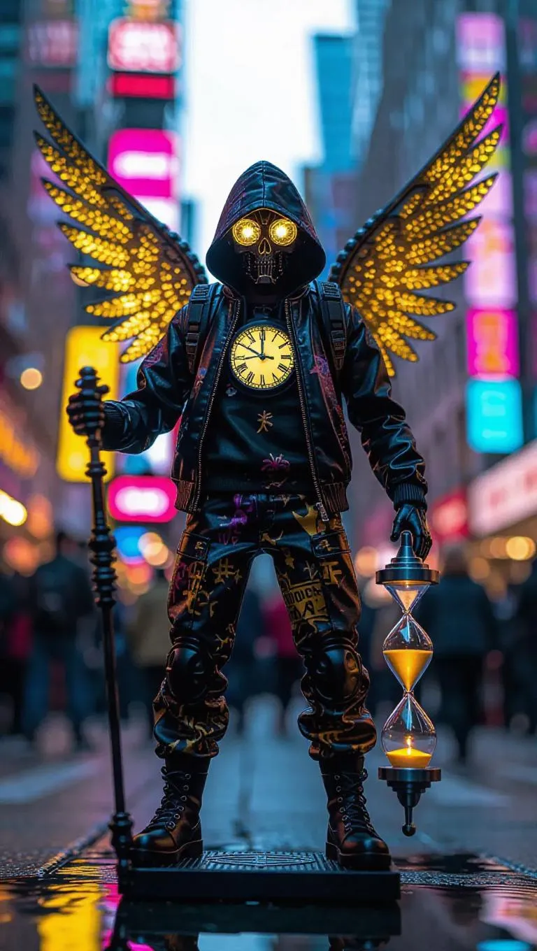 A time traveler action figure with intricate clock-shaped wings and an hourglass staff glowing with radiant golden light. Wears a casual outfit adorned with graphic prints. The toy box showcases a modern street art design. Background: An urban landscape filled with graffiti, neon signs, and lively street performers. Style: Contemporary.