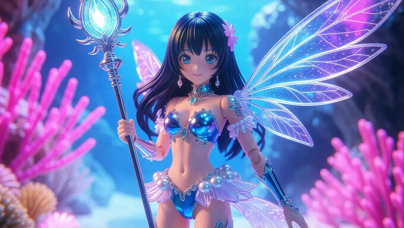A magical girl action figure with translucent, water-like wings, holding a staff that glows with brilliant aqua energy. Her eyes sparkle like playful dolphins, and her outfit is adorned with intricate pearls and colorful shells. The toy box features a mesmerizing ocean wave design, set against an enchanting underwater grotto with vibrant coral and fluttering sea fans. Style: Realistic with an aquatic fantasy twist.