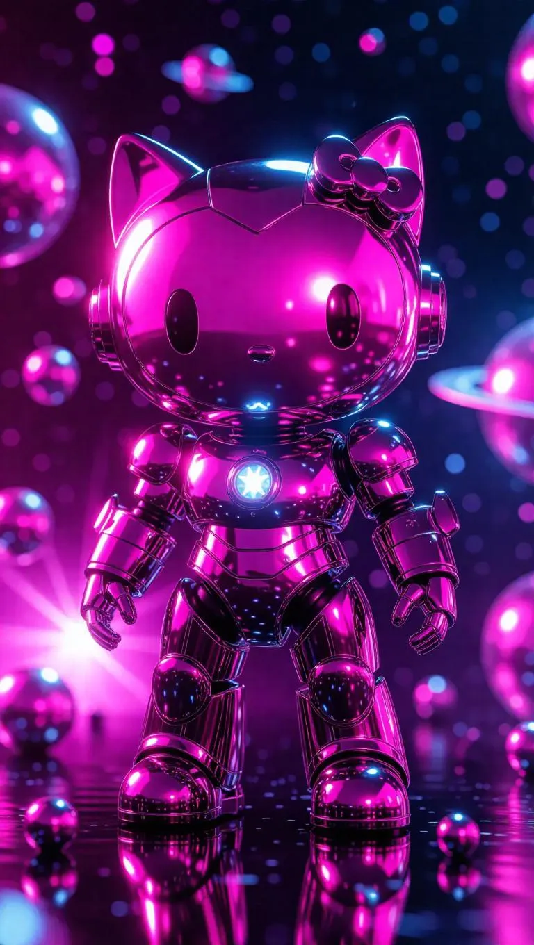 A glimmering pink and silver robotic Hello Kitty mech figure with alien ears and a star-shooting bow stands prominently. The figure's packaging features galaxy-themed designs and cartwheel-shaped holographic labels, including extra gear points. The background illustrates a cosmic toy galaxy, filled with spinning mechanical planets and a dazzling, extraterrestrial atmosphere. Twinkling, starlit light casts soft highlights on the figure, enhancing its shimmer. The style fuses whimsical and cosmic, showcasing interstellar exploration.