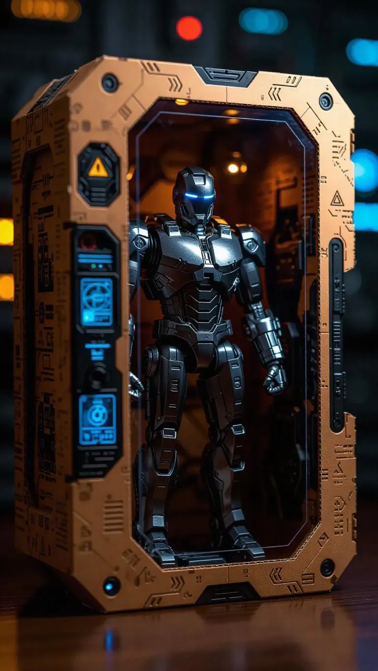 A high-quality product photograph of an action figure box set featuring a robot. The action figure is packaged inside a futuristic-themed cardboard box with a clear front window. The figure, detailed and slightly stylized, is made of metallic parts. Included are a miniature control panel, a hologram projector, a toolset, and a tiny drone. Studio style, clean background, professional lighting, emphasizing the intricate details and premium packaging.