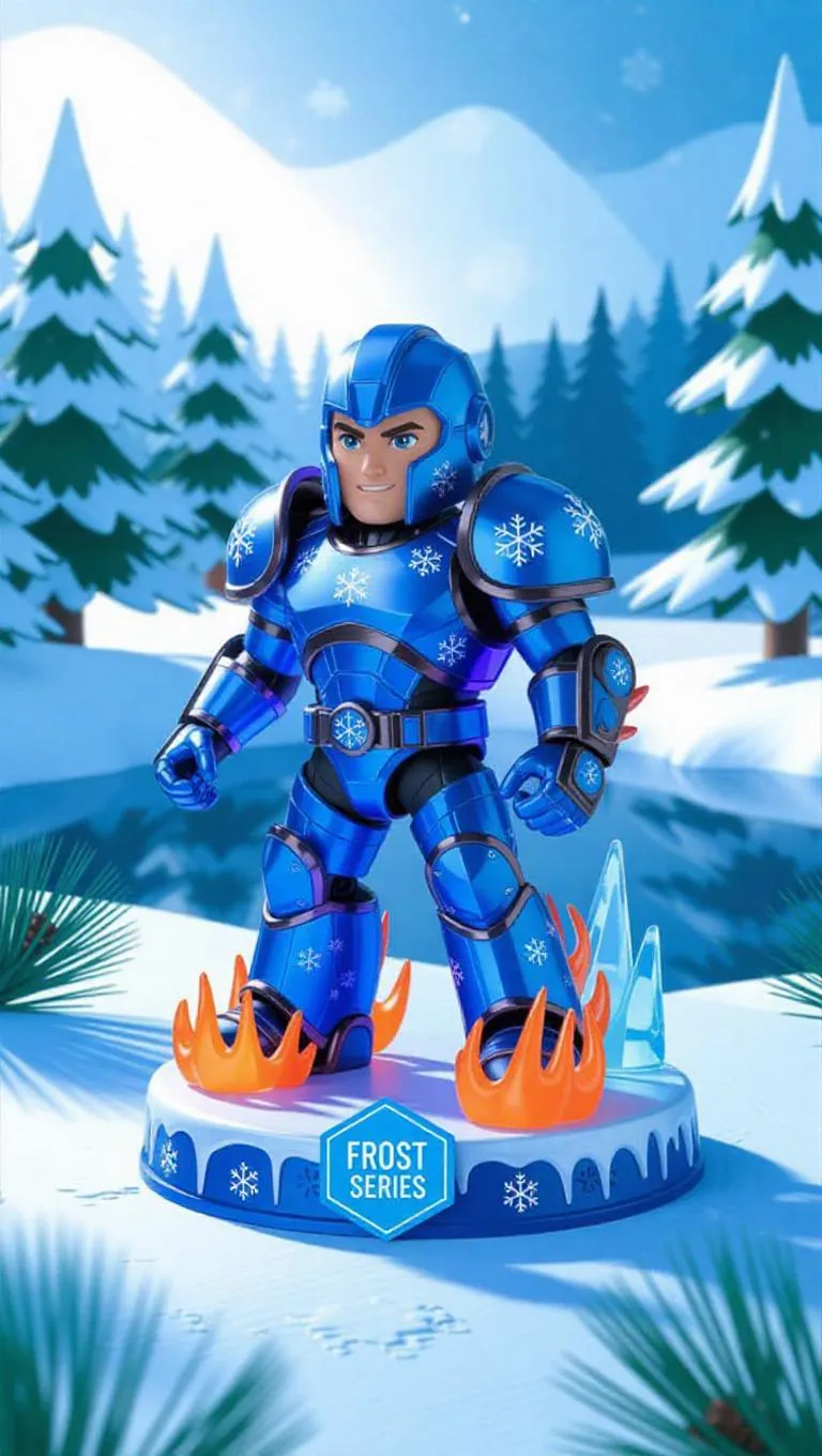 A winter-themed racer toy figure with icy armor, flame wheels, and snowflakes. The figure stands on a base with frost and ice effects and winter decorations, featuring a “Frost Series” blue badge. The background depicts a snowy landscape with pine trees and a frozen lake, bathed in soft winter light casting shimmering shadows. The style is crisp and cool, emphasizing the beauty and serenity of winter.
