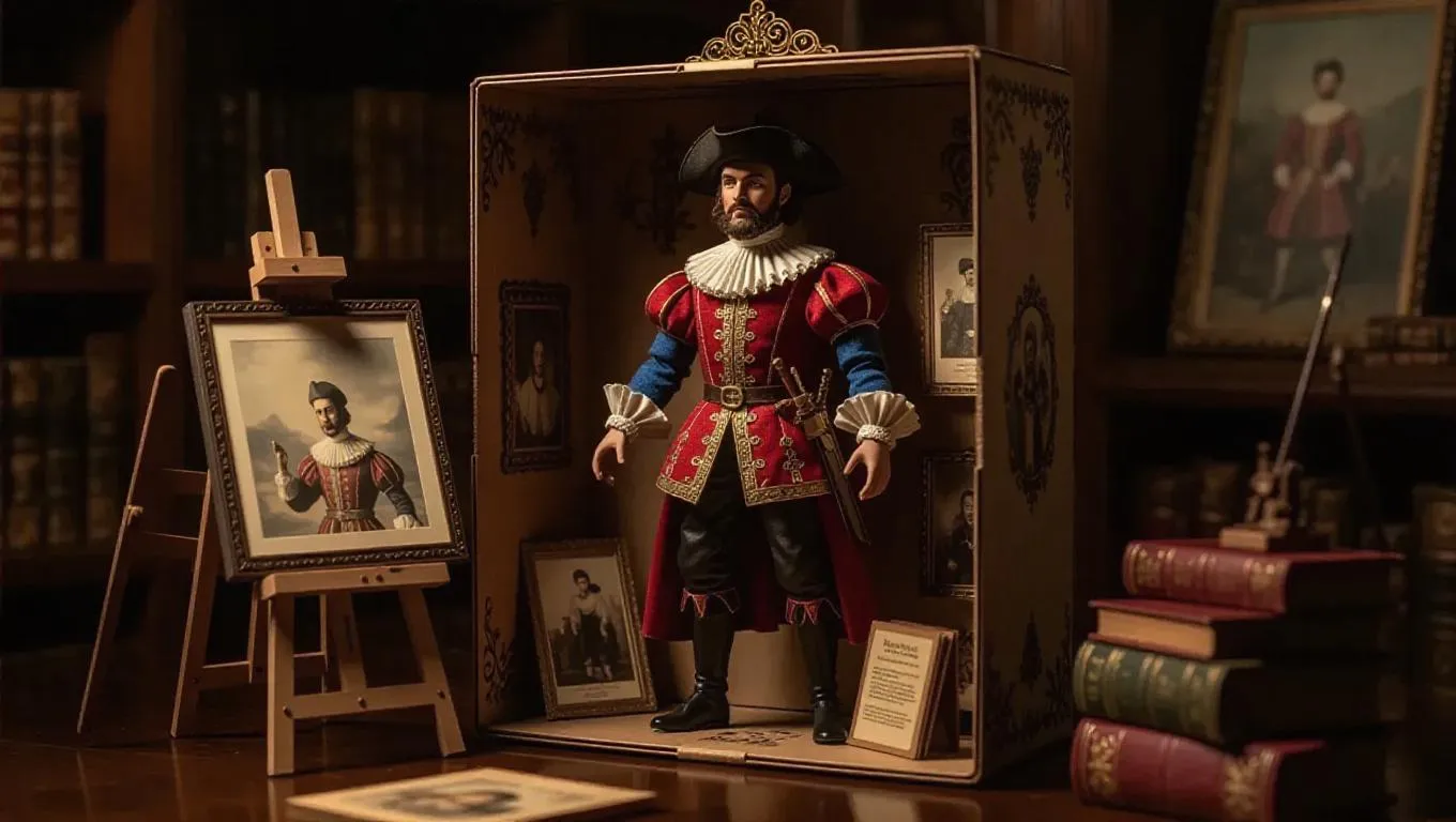 A high-quality product photograph of an action figure box set featuring a historical figure from the Renaissance. The action figure is packaged inside a Renaissance-themed cardboard box with a clear front window. The figure, detailed and slightly stylized, wears period-specific clothing. Included are a miniature easel, a palette, a brush, and a tiny book of sketches. Studio style, clean background, professional lighting, emphasizing the intricate details and premium packaging.