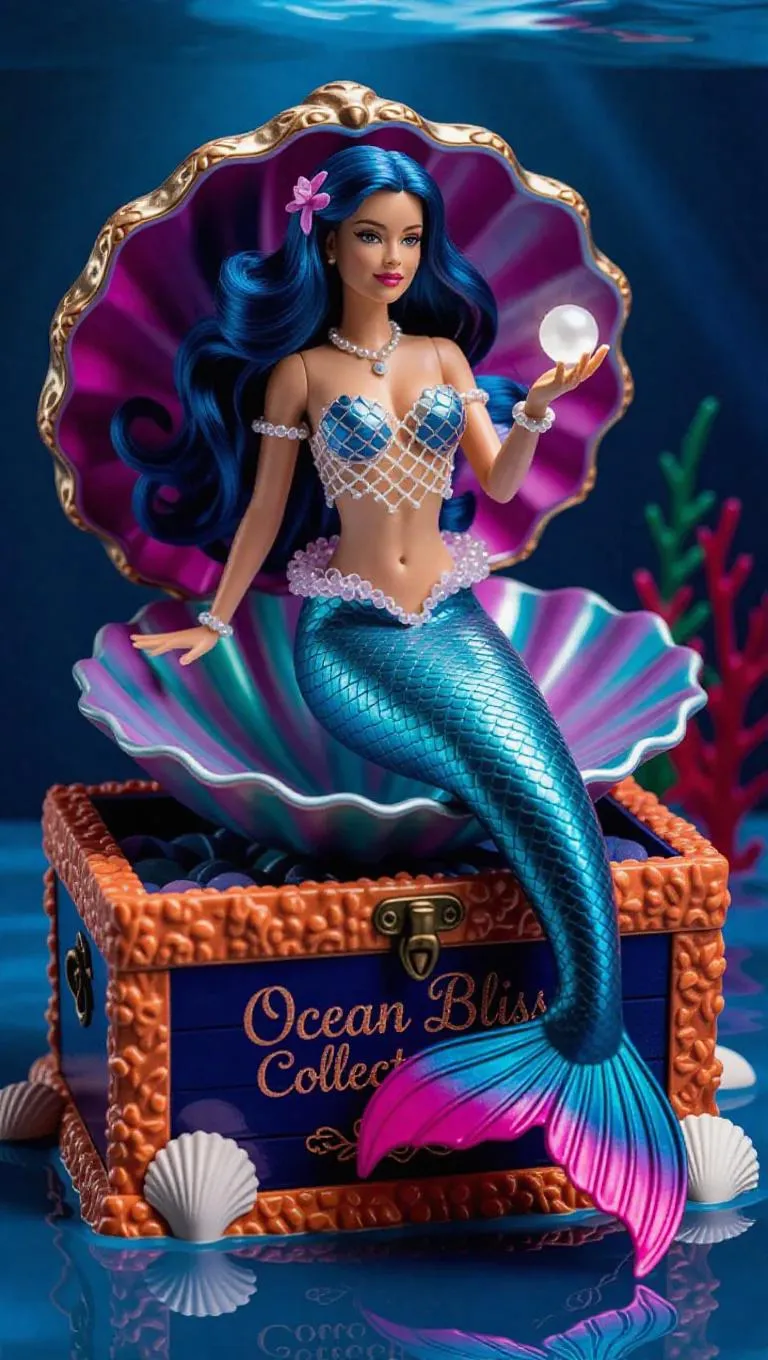 A highly detailed figure of a mermaid enchantress, her long, flowing cobalt hair cascading over her shapely form. Seated on a large, iridescent seashell, her fishtail curls gracefully around her. Pearl-encrusted netting adorns her top, and her tail shimmers with scales in shades of pink and teal. Holding a glowing pearl, emitting a soft, otherworldly light. The toy box resembles an underwater treasure chest, textured like coral and seashells, with "Ocean Bliss Collection" emblazoned on the front. Silky water surface background, teeming with illuminated plankton and floating bubbles. Gentle, filtered evening light creates a dreamy, ethereal glow, enhancing the magical and soothing elements.