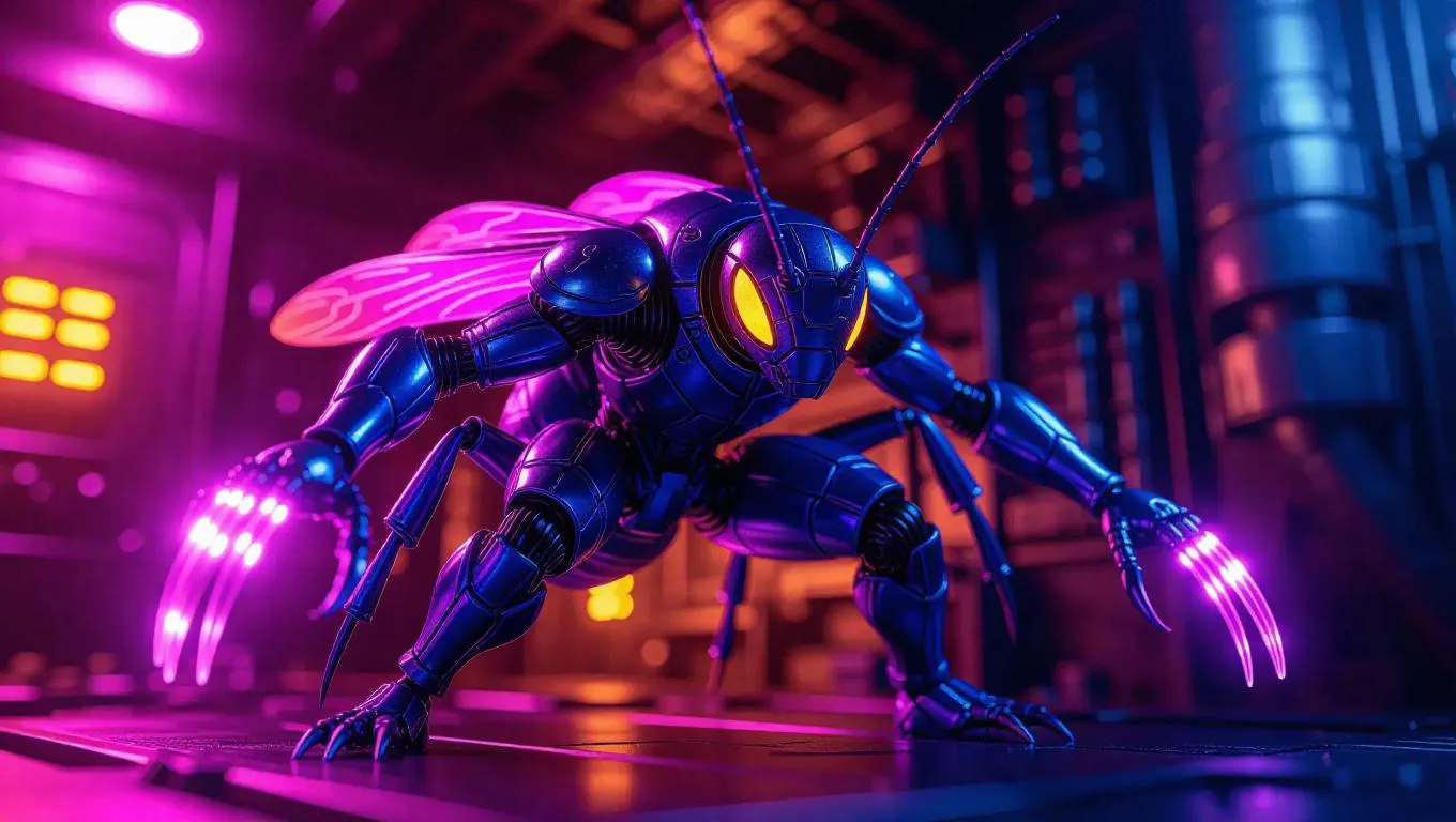 A 1:6 scale superhero insect figure stands in a hovering pose, wearing a metallic blue nano-suit with glowing plasma claws. The figure's intricate motion is captured with premium box inserts featuring delicate motion lines and comic-style effects. Set against a high-energy toy laboratory, the scene is illuminated with soft lavender and warm orange lights, creating a futuristic and vibrant atmosphere. Style: Hyper-realistic with a touch of comic book flair.