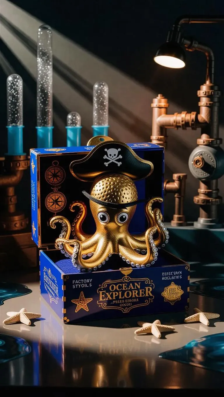 A treasure-hunting octopus toy with gold-plated tentacles, a treasure chest cannon, and a pirate hat eye-patch. The box includes a compass insert, starfish tokens, and a foil "Ocean Explorer" tag. Set against a factory background featuring a mythical creature toy line with bubbly tubes and water pumps. Dim, dramatic light illuminates the scene, casting sharp shadows and highlighting the metallic sheen of the gold-plated tentacles. Realistic style with a touch of whimsy.
