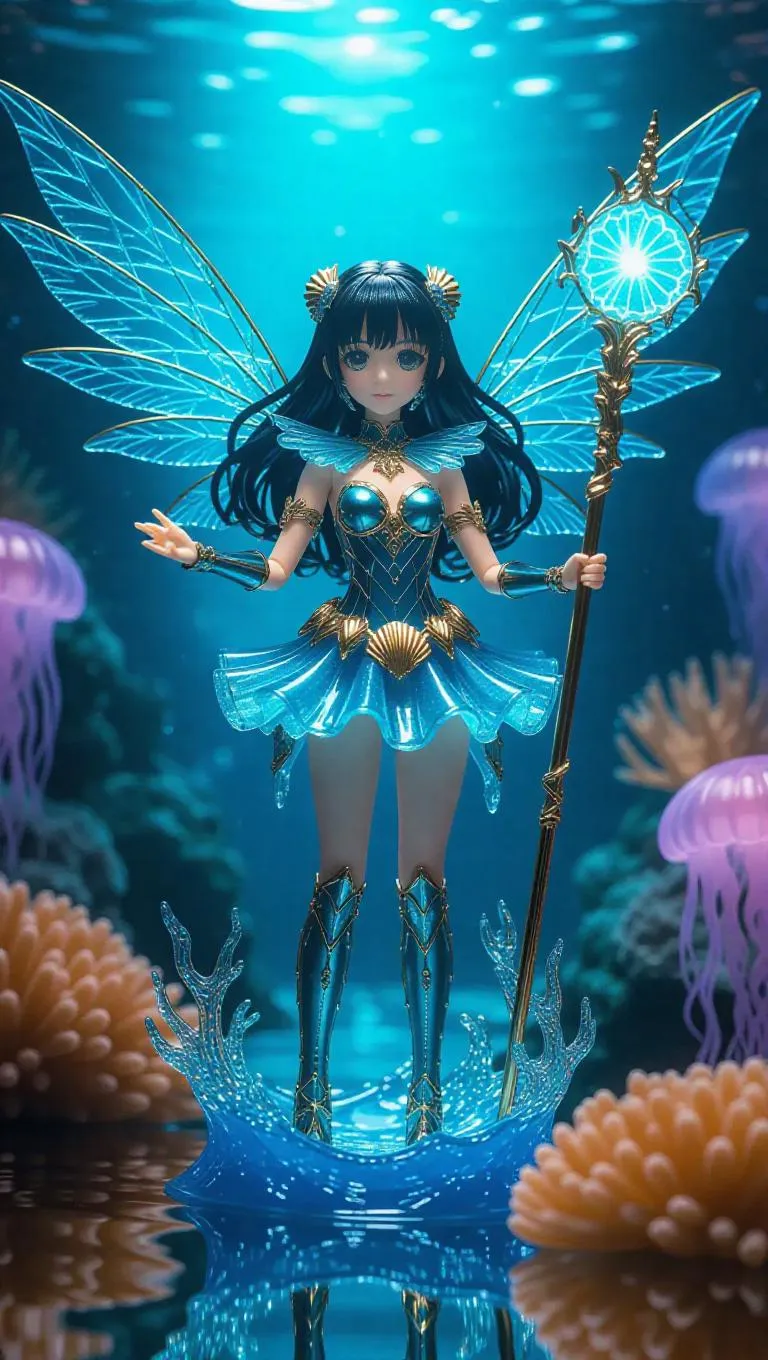 A magical girl action figure with shimmering, water-like wings, holding a staff that glows with vibrant aqua energy. Her eyes sparkle like shimmering ocean waves, and her outfit is adorned with intricate seashells and gold accents. The toy box features a mesmerizing ocean wave design, set against an enchanting underwater grotto with vibrant coral and mesmerizing jellyfish. Style: Realistic with an aquatic fantasy twist.