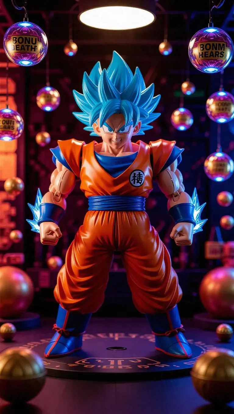 A high-gloss orange and blue robotic Goku mech figure with radiant energy aura hair and a Kamehameha-launching arm stands prominently. The figure's packaging is adorned with dragon ball-themed designs and energy orb-shaped holographic labels, including bonus gear arms. The background showcases a lively toy factory filled with floating mechanical dragon balls and a cheerful, playful atmosphere. Soft, warm light casts gentle highlights on the figure, enhancing its glossy finish. Style: Adorable and futuristic with a touch of cyberpunk flair.