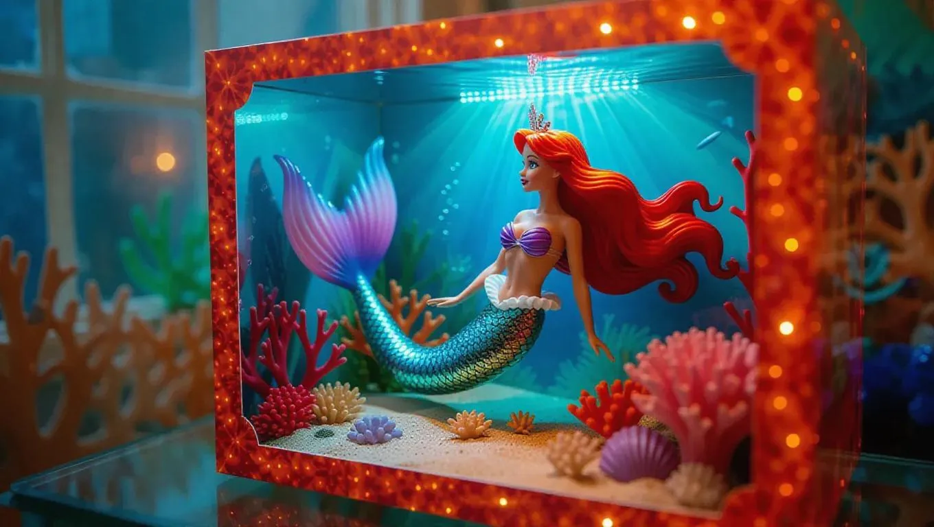 A resin mermaid toy with glittering scales and flowing hair leans on a coral-shaped rotating platform inside her box. The packaging features an underwater-themed design with a fold-out ocean card. Gentle, azure light infiltrates through expansive windows in a tropical toy factory, creating a serene and magical glow. Dreamlike style merges realism with oceanic fantasy.