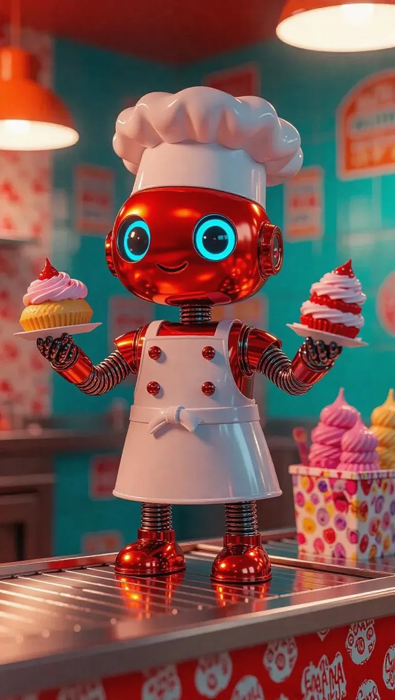 A toy robot chef with blend arms, a pastry-launching backpack, and a sweet chili sprayer. The robot has a shiny, metallic body with exaggerated, cartoonish features. It stands on a kitchen-style toy conveyor belt with bubbling effects, surrounded by nostalgic cafe decor and a whimsical candy pattern on the packaging. Soft, radiant lighting enhances the robot’s warm colors, creating a cheerful and inviting atmosphere. Style: Retro-futuristic.