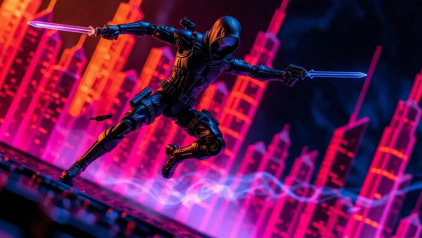 Hyper-detailed toy action figure of a rogue assassin, fusing a pair of daggers with laser sights. Translucent energy waves swirl around the figure, crafted from iridescent resin that shifts colors under varying light. The base showcases a floating, futuristic city skyline, capturing the assassin in a dynamic mid-leap pose.