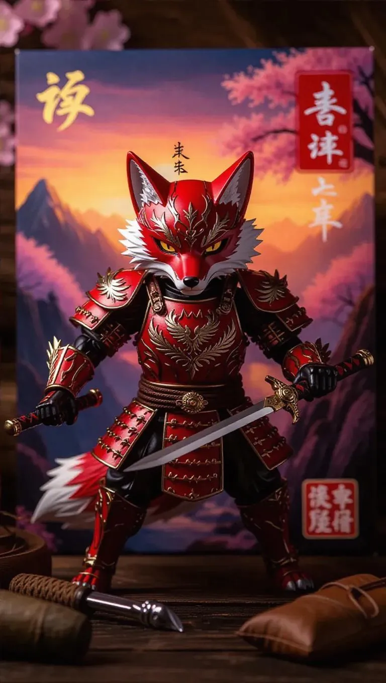 A sleek fox warrior toy clad in red and silver armor with intricate phoenix motifs, wielding dual shurikens. The box showcases a twilight mountain scene with cherry blossom trees and Japanese symbols, including a leather pouch for accessories. Set in a warrior's shrine with stone tools and scrolls, illuminated by warm twilight, enhancing the toy's fierce design. Style: Realistic.