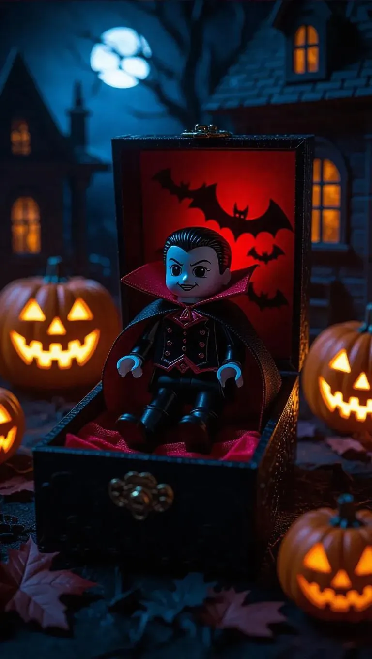 A toy vampire in a cape with crimson lining loungers on a coffin-shaped platform inside his box. The packaging features a haunted house design and a secret drawer filled with miniature bats. Set in a spooky toy factory, the scene is illuminated by the eerie glow of jack-o'-lanterns and the shimmering reflection of moonlight on a dark backdrop, evoking a chilling and mysterious atmosphere. The style merges realism with horror-adventure elements.