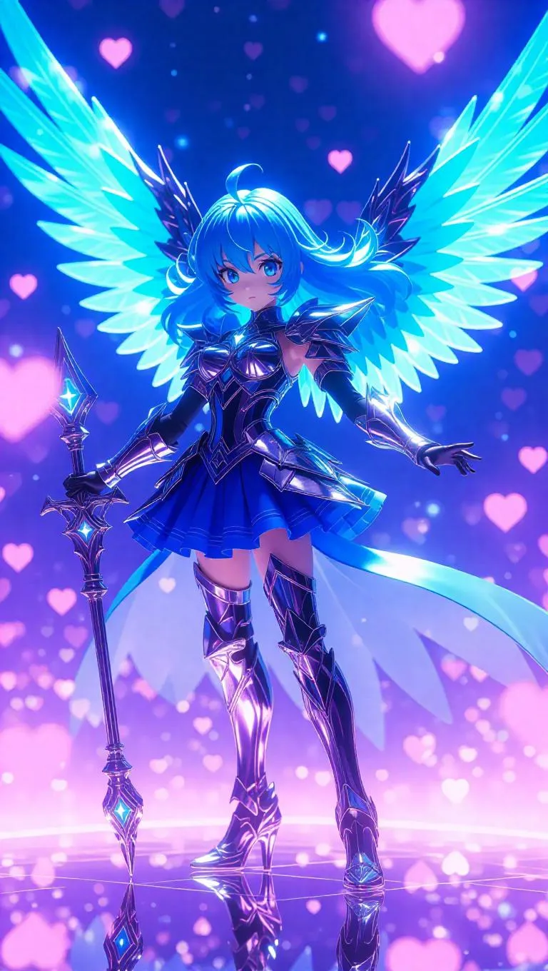 A magical girl action figure with glimmering blue wings, a silver staff, and bright eyes stands in a battle-ready pose. Her toy box is adorned with embossed hearts and features her in an action-packed magical stance, complete with extra dazzling burst accessories. The background is a sparkling toy workshop, enveloped in soft, pastel light that highlights the vivid colors and brings a dreamy feel. Style: Realistic with a fantasy essence.