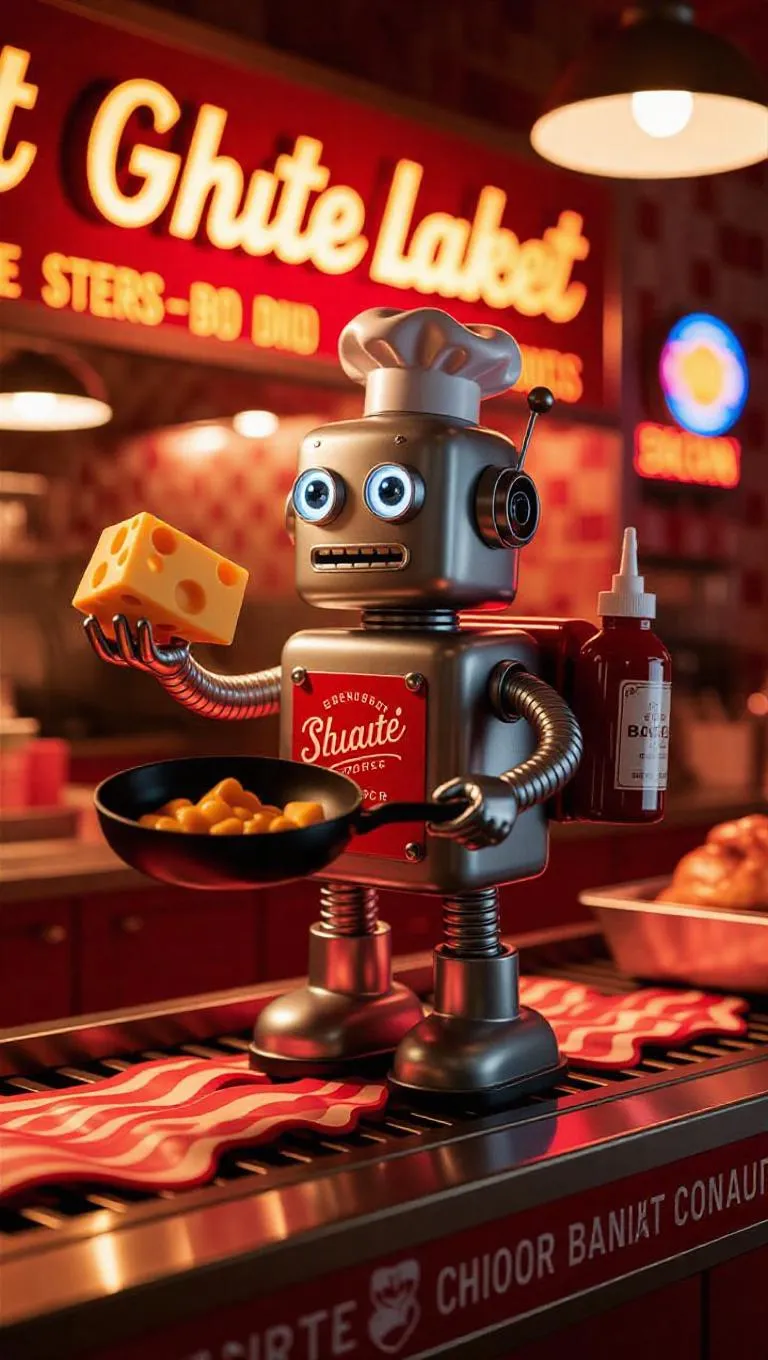 A toy robot cook with frying pan arms, a cheese-launching backpack, and a BBQ sauce shooter. The robot has a polished, metallic body with amusing, exaggerated features. It stands on a toy restaurant conveyor belt system with sizzling sounds, surrounded by vintage bistro designs and a shimmering bacon pattern on the labeling. Soft, glowing lighting emphasizes the robot’s lively colors and the lively movement of the conveyor belt, creating a warm and nostalgic ambiance. Style: Retro-futuristic.