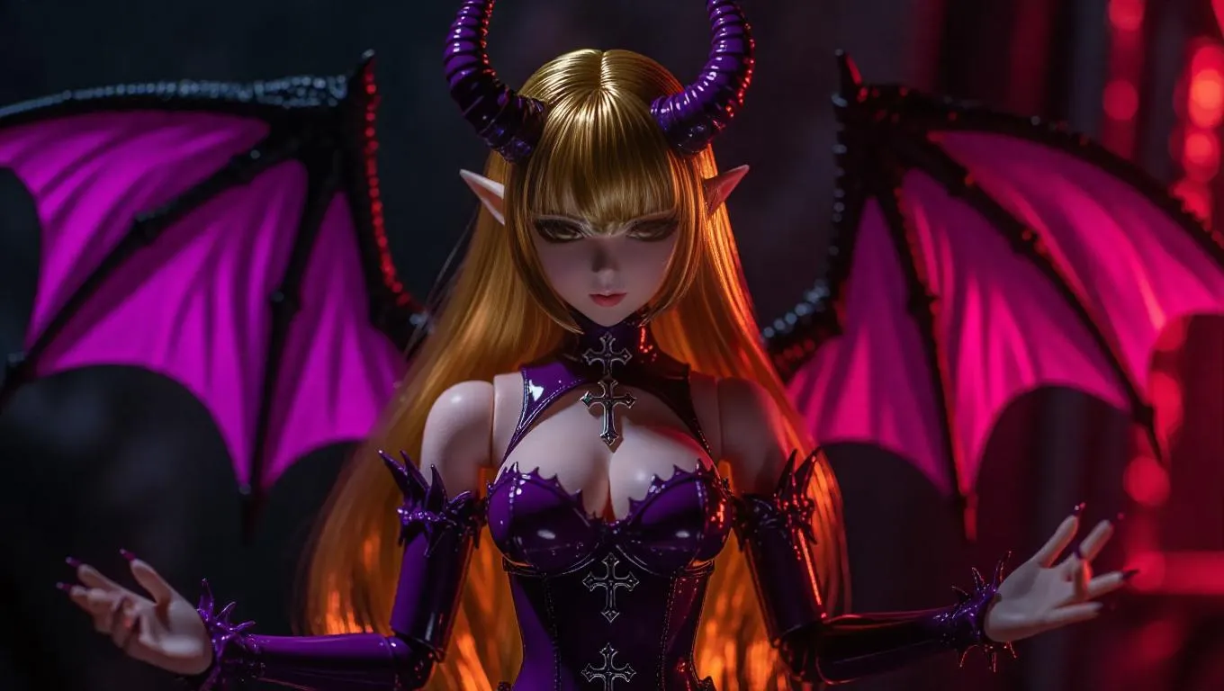 A seductive demon girl action figure with deep purple horns, dragon wings, and a daring white latex outfit adorned with silver crucifixes. Her long, flowing gold hair shimmers, and her jewel-toned eyes have a mystic glint. The toy packaging features cursed inscriptions, glossy leather textures, and a transparent crimson-touched window. In the factory, molten molds and shimmering smoke surround the assembly lines, creating a forbidden, gothic atmosphere. Lighting is dramatic with cool highlights and harsh shadows. Style: Dark Fantasy, Gothic.