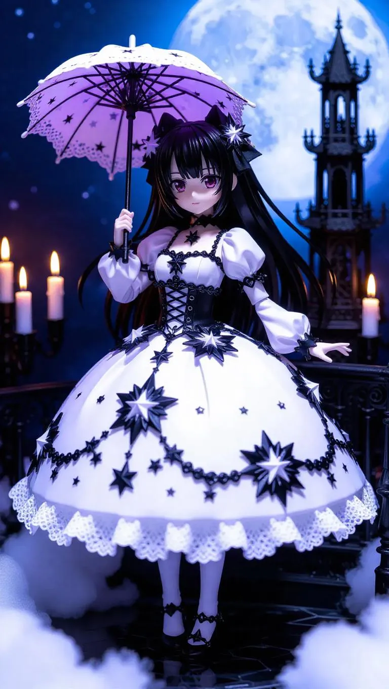 A gothic lolita action figure, mysterious and fierce, dressed in a lavish dress adorned with intricate star and moon motifs. Wields a parasol that transforms into a celestial spear. Toy box showcases a hauntingly beautiful sky tower surrounded by spirited clouds. Background: A shadowy balcony with flickering candles casting dreamy shadows.