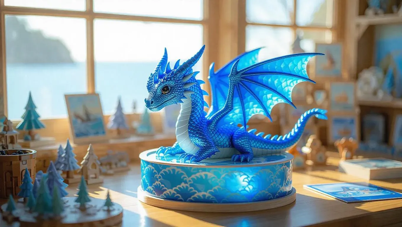 A toy dragon with glimmering scales and deep-blue scales rests on a rock-shaped spinning base inside its container. The packaging features a wave-patterned design and a slide-out adventure card. Soft, sapphire light illuminates vast windows in a coastal toy workshop, creating a tranquil and enchanting atmosphere. Playful style merges realism with mythical lore.