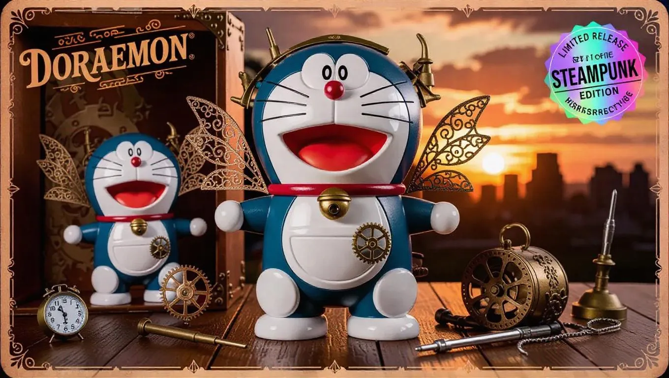A steampunk-inspired collectible action figure of Doraemon, packaged in a vintage-inspired toy box. Doraemon features a copper and antique bronze redesign with embellished gears, glowing aquamarine eyes, and cloth accents. His round body is detailed with steam vents and mechanical wings, and his bell and pouch are upgraded with Victorian lacework. The packaging showcases neat fonts, monochrome action poses, and a holographic 'Limited Release Steampunk Edition' sticker. Included accessories: clockwork gadget arm, vintage screwdriver. Background: retro-futuristic Sendai skyline at sunset, high detail, warm lighting, earthy tones.