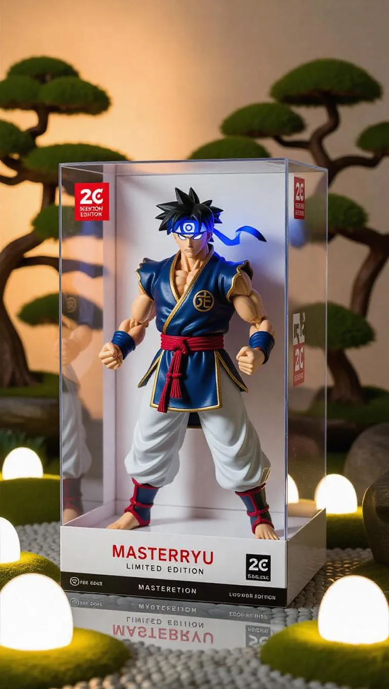 An anime-style collectible action figure of Ryu, reimagined as a martial arts master with traditional garb, glowing blue headband, and powerful fists. Displayed inside a transparent premium toy box with minimalist linings, Hadouken stickers, and 'MasterRyu Limited Edition' branding. Zen garden background with glowing stones, floating bonsai trees, and serene aesthetics.