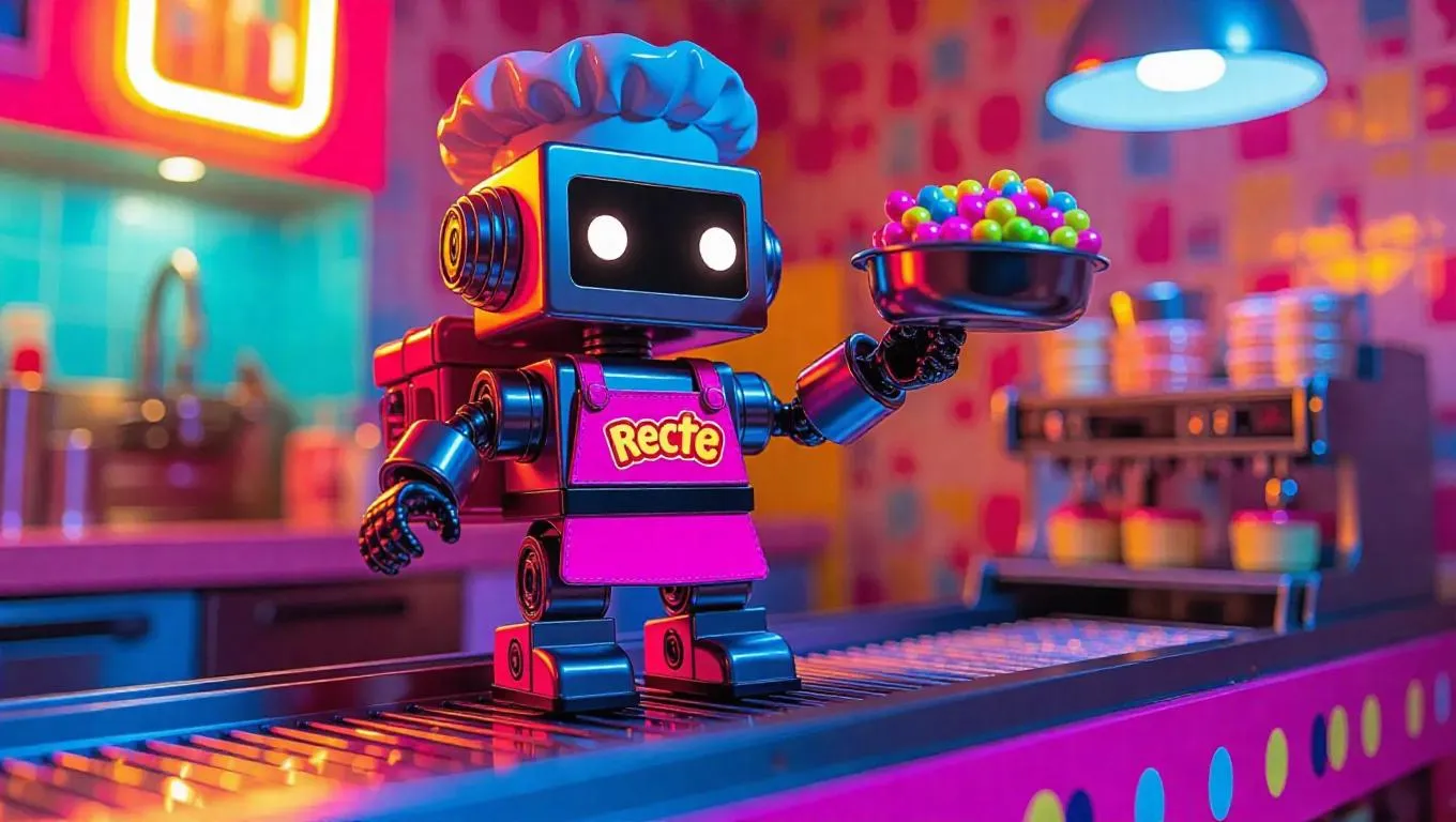 A toy robot chef with pan arms, a candy-launching backpack, and a chocolate syrup blaster. The robot has a shiny, metallic body with silly, exaggerated features. It stands on a kitchen-style toy conveyor belt system with sizzling effects, surrounded by playful diner designs and a rainbow sprinkles pattern on the packaging. Soft, colorful lighting highlights the robot’s vibrant colors and the dynamic action of the conveyor belt, creating a fun and spirited atmosphere. Style: Retro-futuristic.
