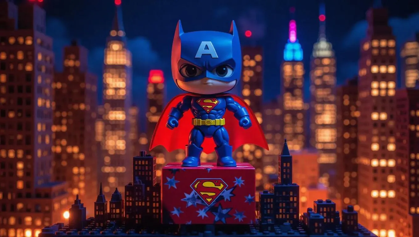 An aged toy superhero with vibrant blue accents stands atop a city skyline platform inside his action-themed packaging. The box features a removable emblem sticker. In a night-lit urban toy factory, electric lights pulse against dark surfaces, enhancing the thrilling, heroic atmosphere. Realistic superhero aesthetics.