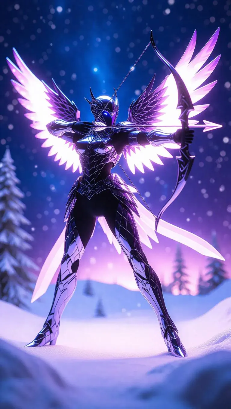 A celestial archer action figure with radiant star-shaped wings and a bow emitting cosmic energy, clad in an outfit adorned with shimmering scales. Toy box features a deep space theme. Background: An icy tundra with twinkling snowflakes and distant auroras. Style: Hyper-realistic with a winter fantasy twist.