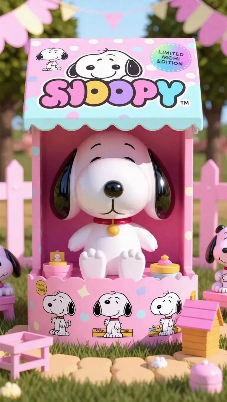 A mochi-inspired collectible action figure of Snoopy, packaged inside a soft, pastel toy box. Snoopy has a squishy, mochi-like design with a glossy finish and a round, chubby body. Oversized, adorable nose, large, sparkling eyes. Packaging features sweet, pastel fonts, mochi illustrations of Snoopy in cute poses, holographic 'Limited Mochi Edition' sticker. Includes accessory parts like a mini doghouse and tiny bowl. Cozy, pastel-themed dog park background. Style: mochi, kawaii, high detail, collectible figure, soft lighting, pastel colors.