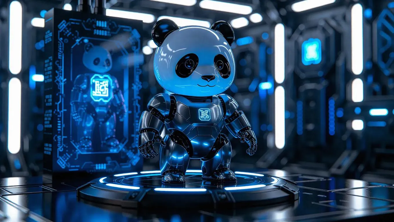 A toy robot panda with chrome silver and vivid blue panels stands on a rotating platform inside its packaging. The box pulses with kinetic energy effects, featuring artistic logos and a QR code that unlocks unique powers. Set in a high-tech toy assembly facility, the scene is illuminated by icy, white lights casting sharp shadows, emphasizing the sterile and advanced setting. The style is sleek and polished, blending realism with futuristic aesthetics.