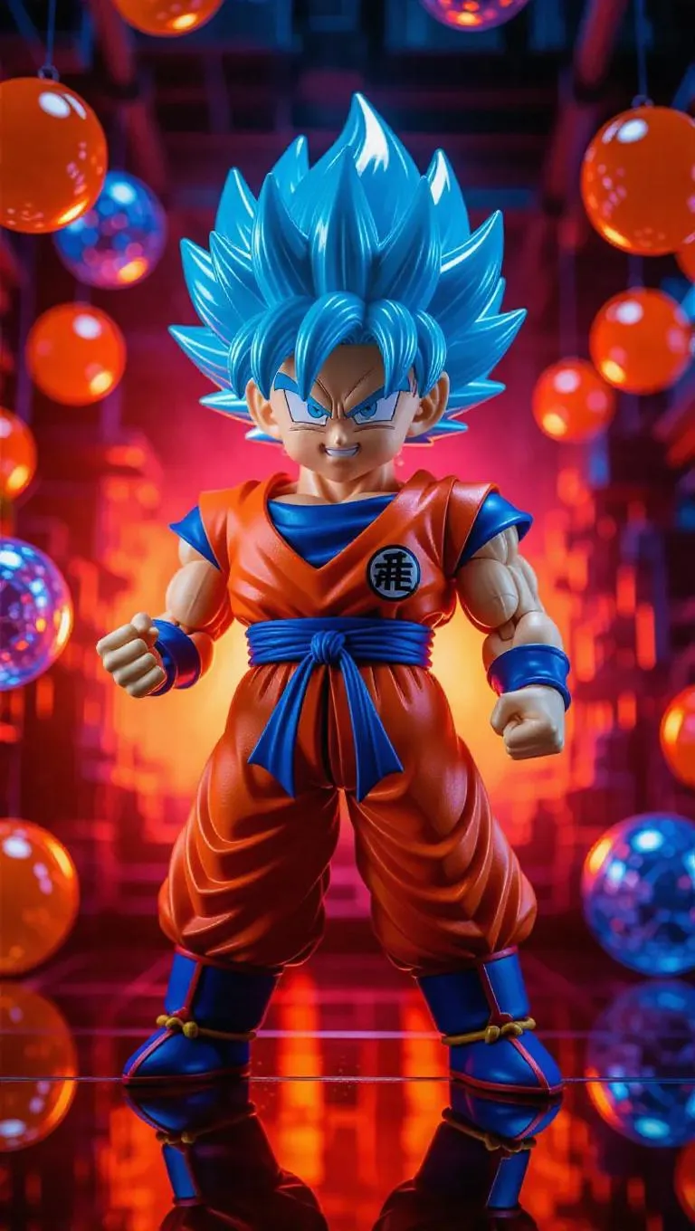 A high-gloss orange and blue robotic Goku mech figure with vivid energy aura hair and a Kamehameha-launching arm stands boldly. The figure's packaging is adorned with dragon ball-themed designs and energy orb-shaped holographic labels, including bonus gear arms. The background showcases a bustling toy factory filled with floating mechanical dragon balls and a spirited, action-packed atmosphere. Soft, warm light casts gentle highlights on the figure, enhancing its glossy finish. Style: Adorable and futuristic with a touch of cyberpunk flair.