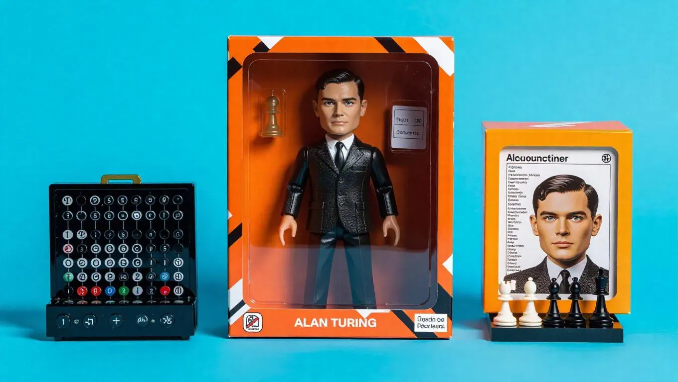 A realistic product photograph of an action figure box set featuring Alan Turing. The action figure is packaged inside a retro computing-themed cardboard box with a clear front window. Include relevant assets/accessories such as: a miniature Enigma machine, coding sheets, a chess set. The figure itself looks detailed, slightly stylized, with his neat hair. High-quality lighting, clean background, studio style, product photography